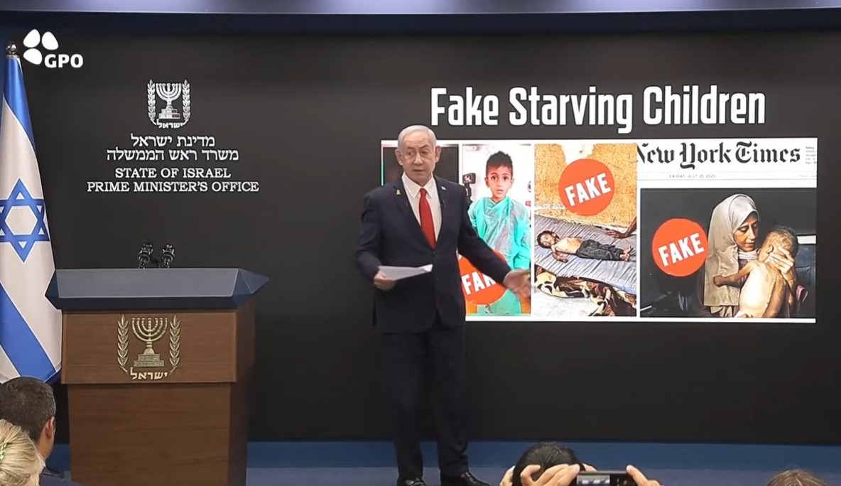 베냐민 네타냐후 이스라엘 총리가 2025년 8월 10일 참석한 기자회견에서 가자지구의 기아 현황에 대한 외신 보도를 “국제적 가짜뉴스 캠페인(global campaign of lies)”이라고 칭하며 비판하였다. 특히 각국 언론을 통해 확산되고 있는 사진 자료 속 가자지구 저체중 아동들의 체형은 기아가 아닌 척수성 근위축증(Spinal Muscular Atrophy), 뇌성마비(Cerebral Palsy) 등과 같은 기타 기저질환이 원인이라고 주장하며 이를 두고 “가짜 굶주린 아이들(fake starving children)”이라고 발언하였다.